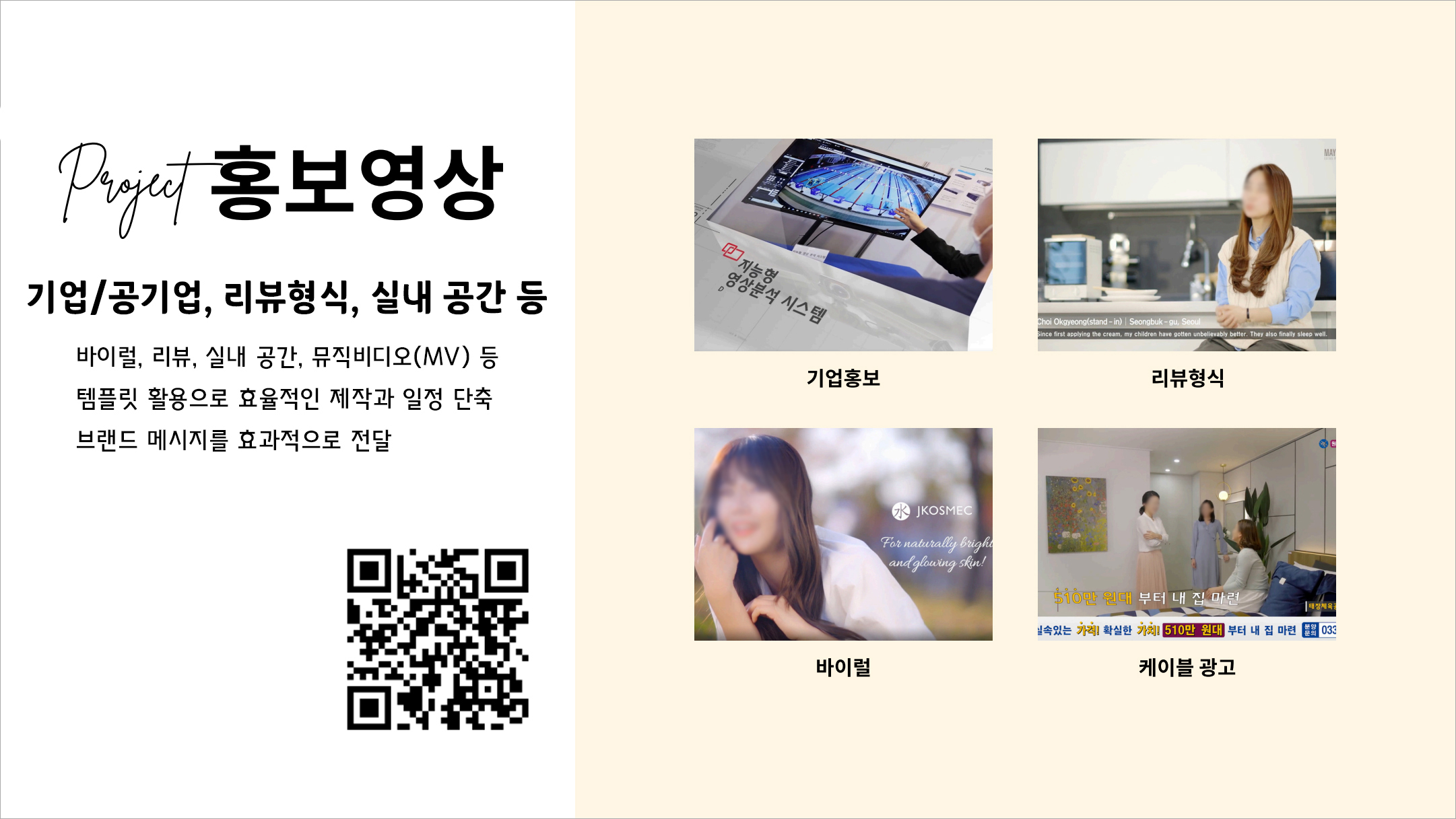 기업 / 공기업 등 홍보영상부터 바이럴, 리뷰, 실내 공간, 뮤직비디오 형식까지